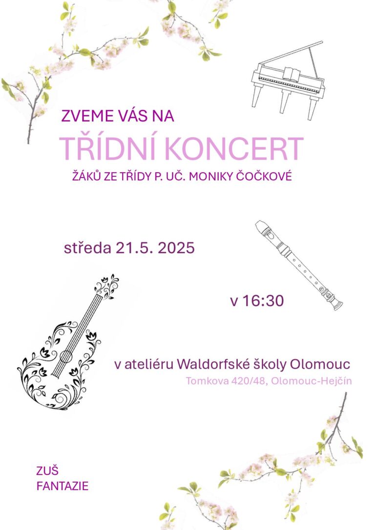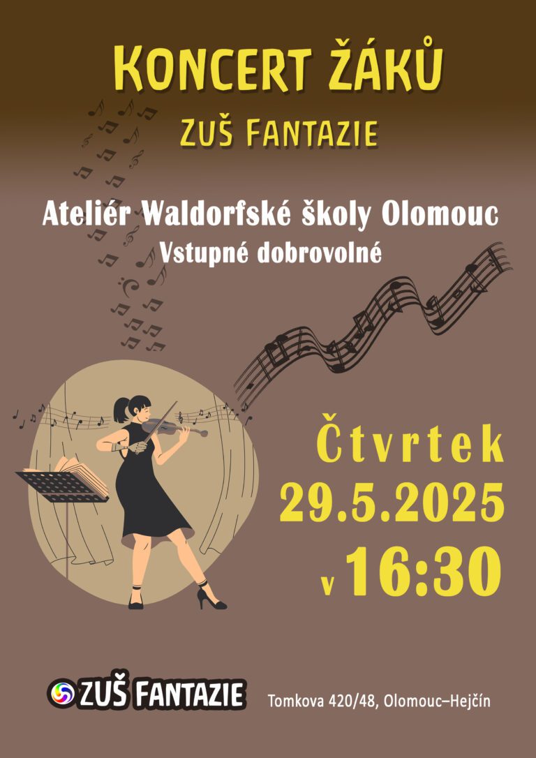 Srdečně Vás zveme na Koncert žáků ZUŠ Fantazie, který ve uskuteční ve čtvrtek 29. 5. 2025 v 16:30 hodin v ateliéru Waldorfské školy Olomouc. Představí