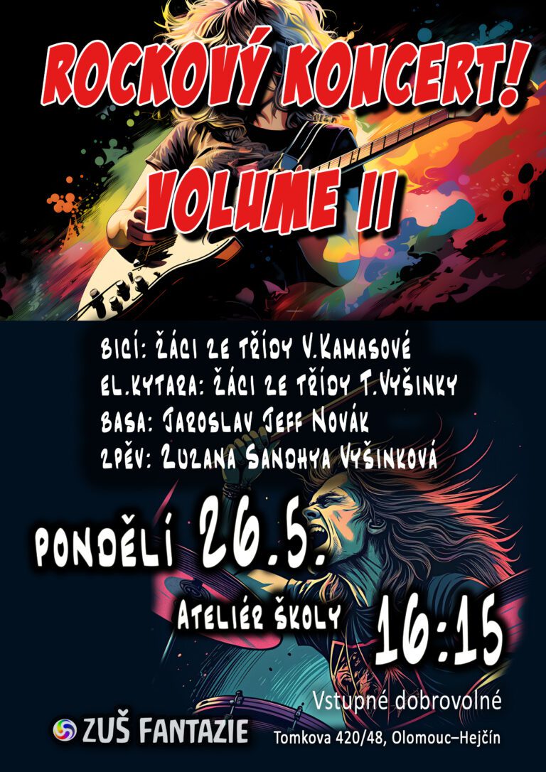 Přípravy na ROCKOVÝ KONCERT VOLUME II ZUŠ Fantazie jsou v plném proudu, Těšíme se na vás v pondělí 26. 5. 2025 v 16:15 hodin v