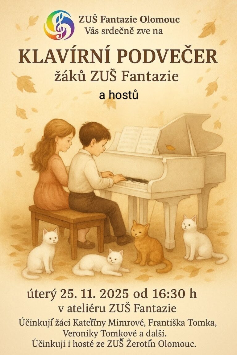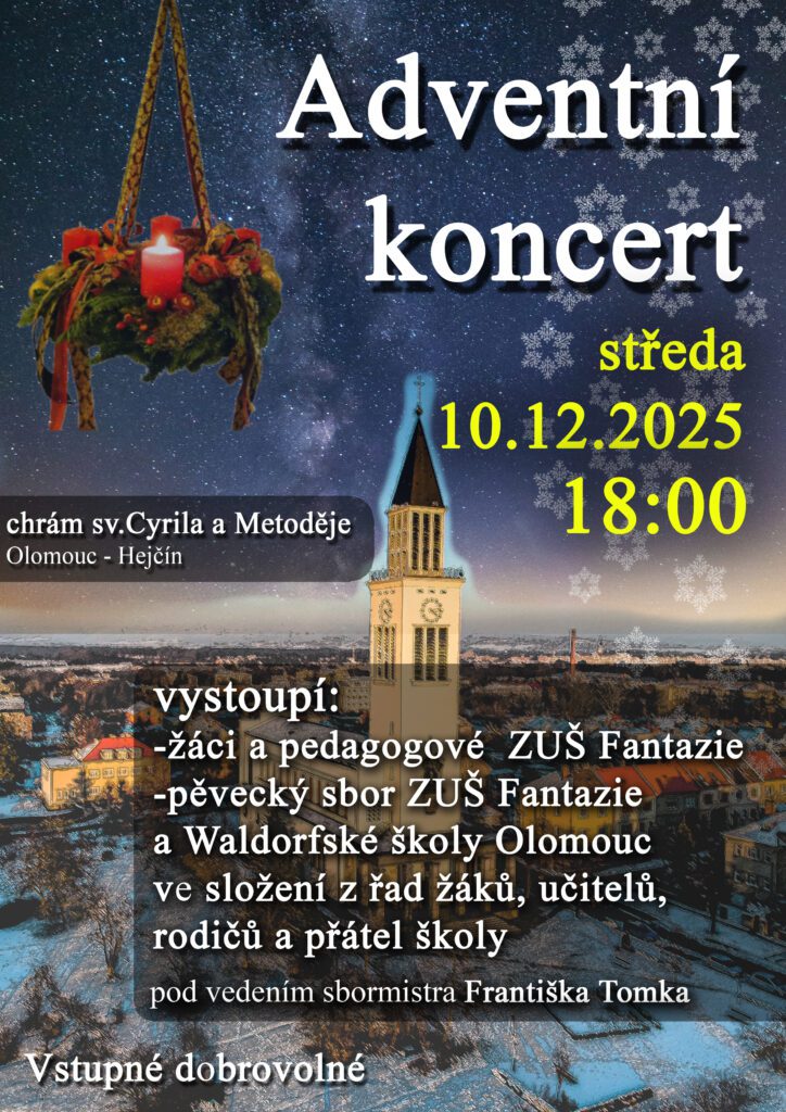 přijměte srdečné pozvání na Adventní koncert ZUŠ Fantazie, který se uskuteční ve středu 10. 12. 2025 v 18:00 hodin v chrámu sv. Cyrila a Metoděje Olomouc – Hejčín.