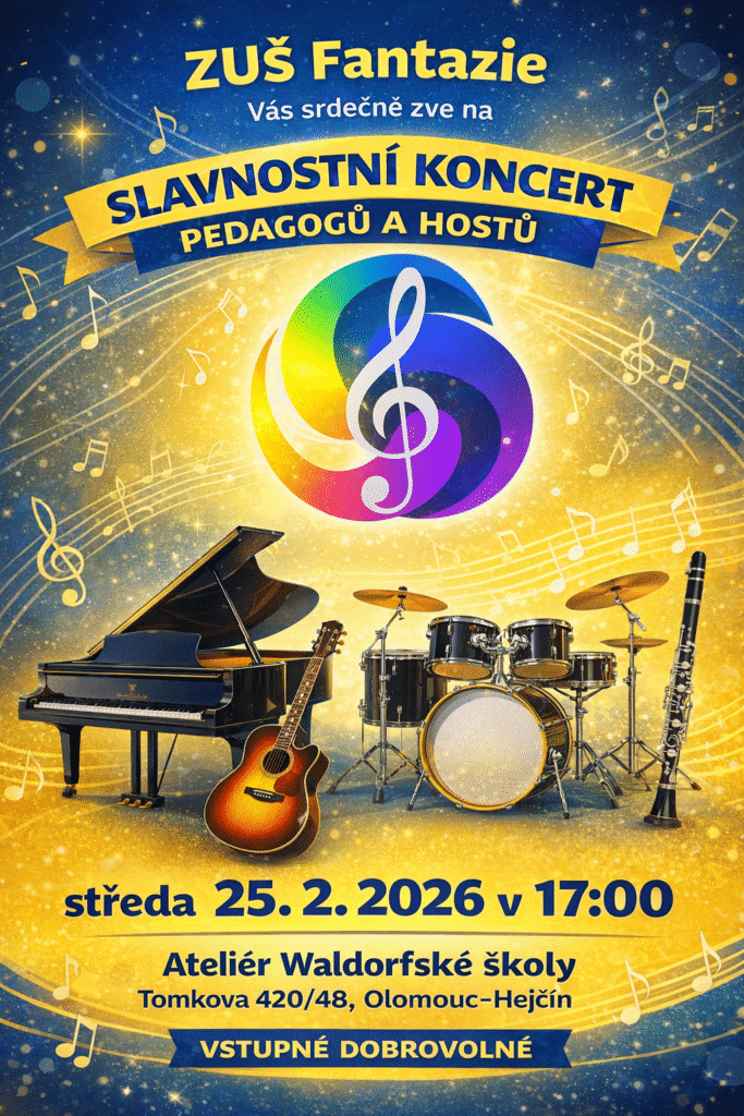 S radostí Vás zveme na tradiční Slavnostní koncert pedagogů a hostů ZUŠ Fantazie, který se bude konat ve středu 25. února 2026 v 17:00 hodin v  Ateliéru Waldorfské školy Olomouc.