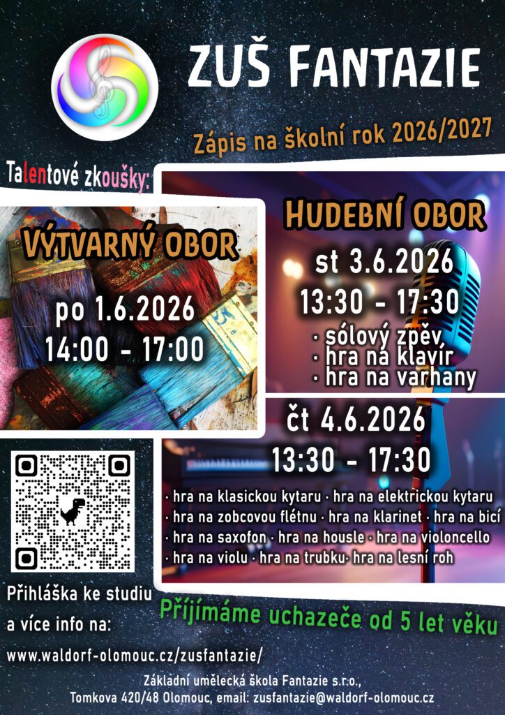 Talentové zkoušky do ZUŠ Fantazie na školní rok 2026/2027 se blíží. Už nyní si můžete vybrat z pestré nabídky studijních zaměření a vyplnit elektronickou přihlášku na webu školy. Zveme všechny zájemce o studium od 5 let do výtvarného i hudebního oboru. Těšíme se na vás!